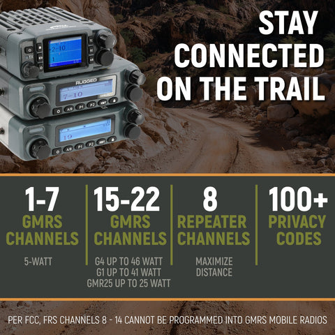All GMRS radios, including Rugged G1, GMR45, GMR25, GMR2, and GMR2 PLUS. All GMRS radios from other manufacturers including Motorola, Midland, Uniden, and many more. Also compatible with FRS radios on channels 1-7 and 15-22.